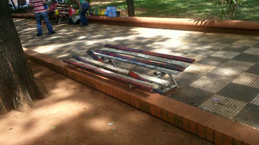 Bancos con respaldos rotos, y otros totalmente deleznables, obligan a los ciudadanos a improvisar un lugar donde sentarse. Lisi Giménez, trabaja en la plaza, vendiendo tereré hace 7 años, e indicó, “en agosto se hicieron las reparaciones, pero solo lo que está a la vista, sobre la peatonal, además hace mucha falta nuevos bancos, ya que estos están destrozados hace años”.