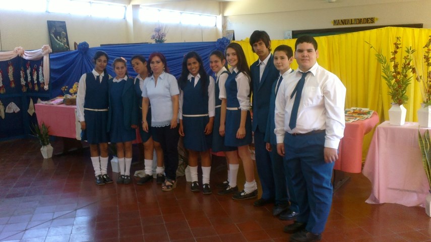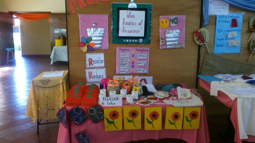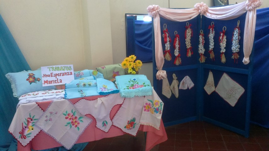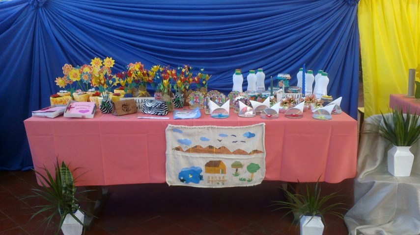 Las actividades presentadas por los alumnos del 1° ciclo fueron confección de cuadros de imágenes religiosas, rosario de isopor, reciclados botellas, cartones, latas, plásticos, arreglos de flores, confección de alfileteros, entre otros interesantes trabajos. Las técnicas aplicadas para estas labores fueron entre otras cosas pintura con temperas, enhebrado, recorte con tijera, pegado con plasticola, entre otros.