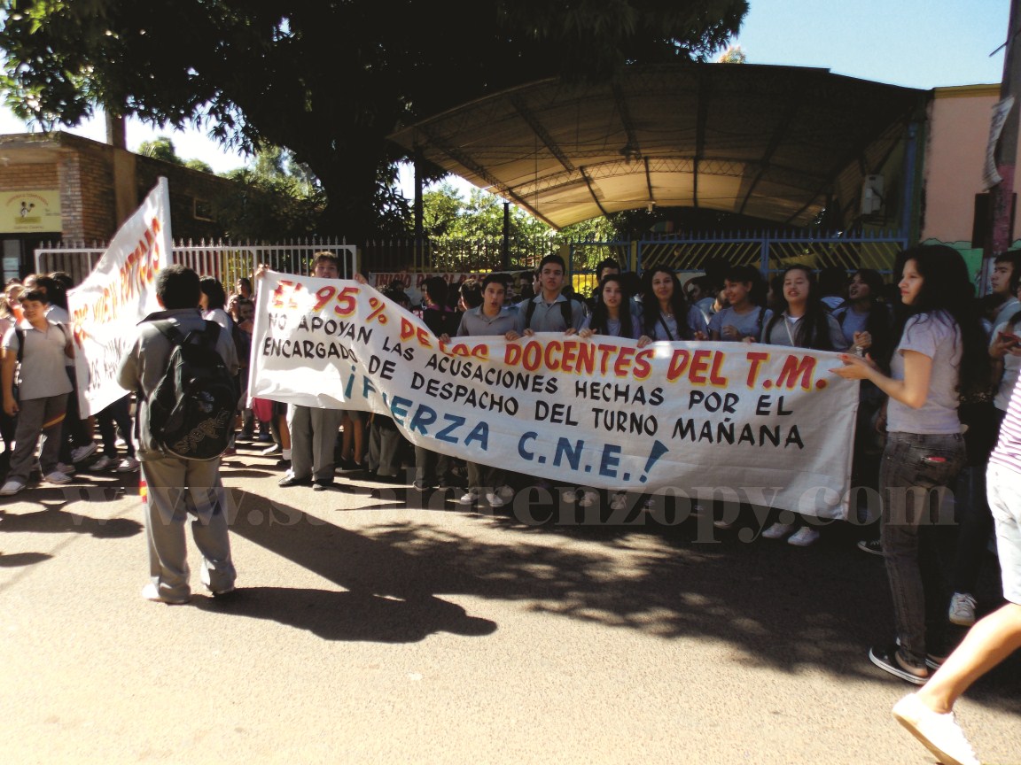 SI PASA 90 DÍAS IRAN A UNA HUELGA INDEFINIDA. Karina Alfonzo alumna del turno tarde del tercer año del Bachillerato Técnico en Administración de Empresas, dijo a nuestro portal que están manifestándose porque el MEC no les lleva en cuenta y que incluso están dispuestos a ir a una huelga indefinida si en una semana el profesor Blas Rogger no vuelve a la institución, “Decidimos manifestaron porque no se está escuchando nuestra voz en el ministerio y no vamos a permitir que nos quiten a nuestro director Blas Rottges, el Ministerio de Educación y Cultura tiene una semana para hacer toda las investigaciones que quieran y después tienen que traernos otra vez a nuestro director, nosotros no estamos ajenos a la intervención, pero noventa días sin director es mucho y si pasa los una semana vamos a ir a una huelga indefinidamente hasta que nos devuelvan a nuestro director, aquí estamos alumnos de los tres turnos”.
