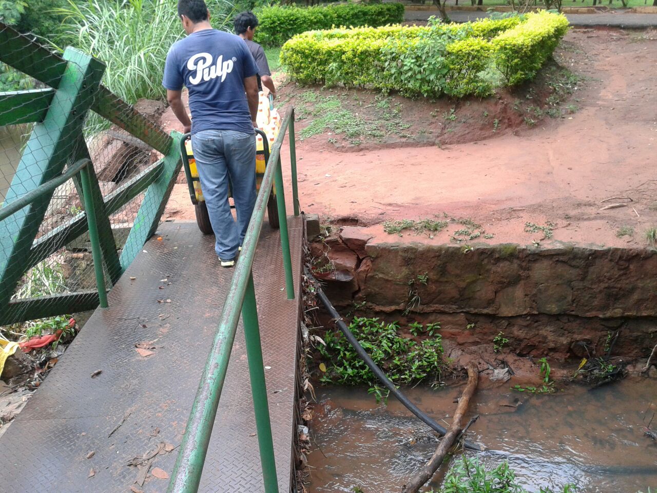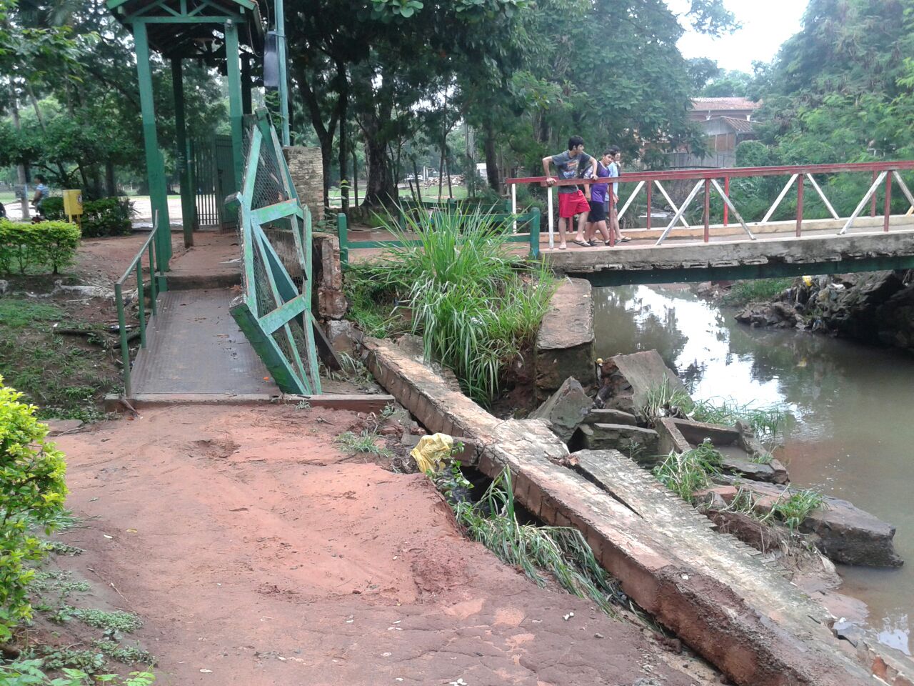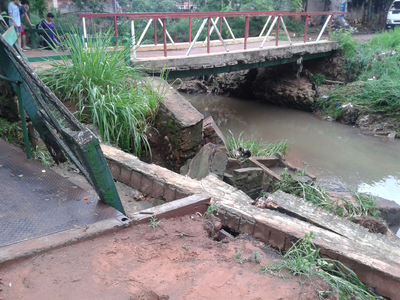 [box type=»shadow» ]Imágenes que fueron enviados a nuestro sistema del WhatsApp, muestra que el puente de entrada a la ciclovía municipal que da a la calle España esta con serios problemas en su estructura e incluso en cualquier momento puede caer, ya que por un lado se ve que la base de un costado del caminero está totalmente derrumbada así como la barra protectora de los usuarios, mientras que en otra se nota que el cimiento donde empieza la pasarela esta tambien cediendo poco a poco. (El lector pidió anonimato).[/box][divider]