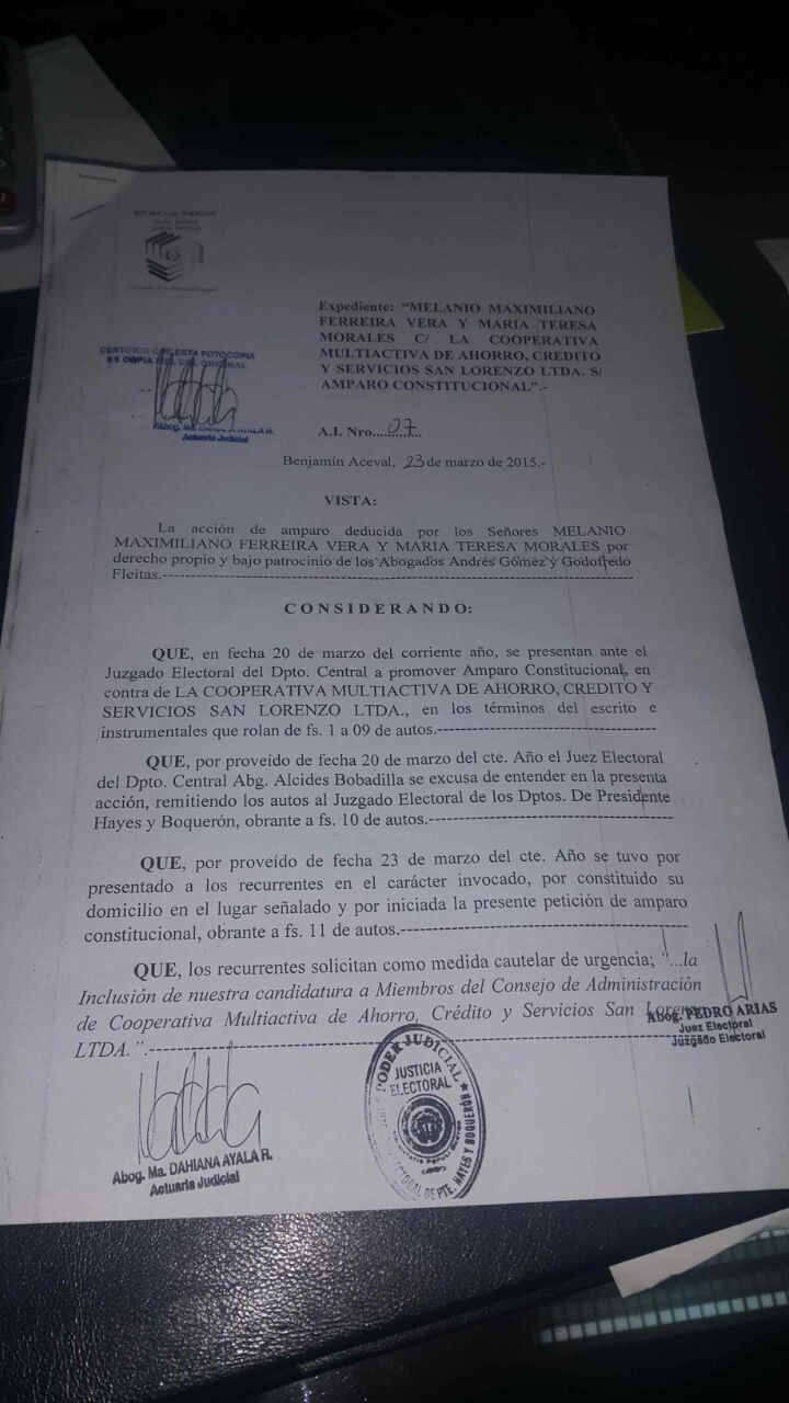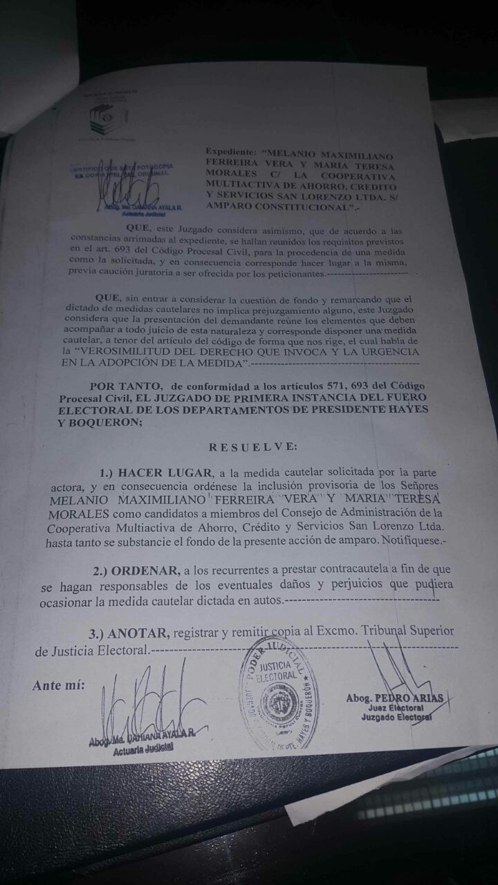 La medida cautelar ha sido pedida en primera instancia en el Juzgado Electoral del dpto. Central, pero como el Juez se excusó en el caso, fue girado al Juzgado Electoral de Pte. Hayes y Boquerón, donde finalmente obligó a la Junta Electoral de la Cooperativa a la inscripción provisoria de los rechazados