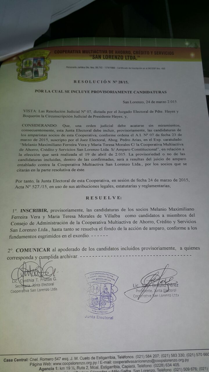 El rechazo de los candidatos del “Movimiento Renacer Cooperativo”, Lic. Melanio Ferreira y la Sra. Teresa Morales de Villalba, por parte de la Junta Electoral de la Cooperativa San Lorenzo ha sido de oficio. No obstante los afectados recurrieron a una medida cautelar y el Juez obligó al organismo electoral cooperativo a inscribir en forma provisoria a los mismos.