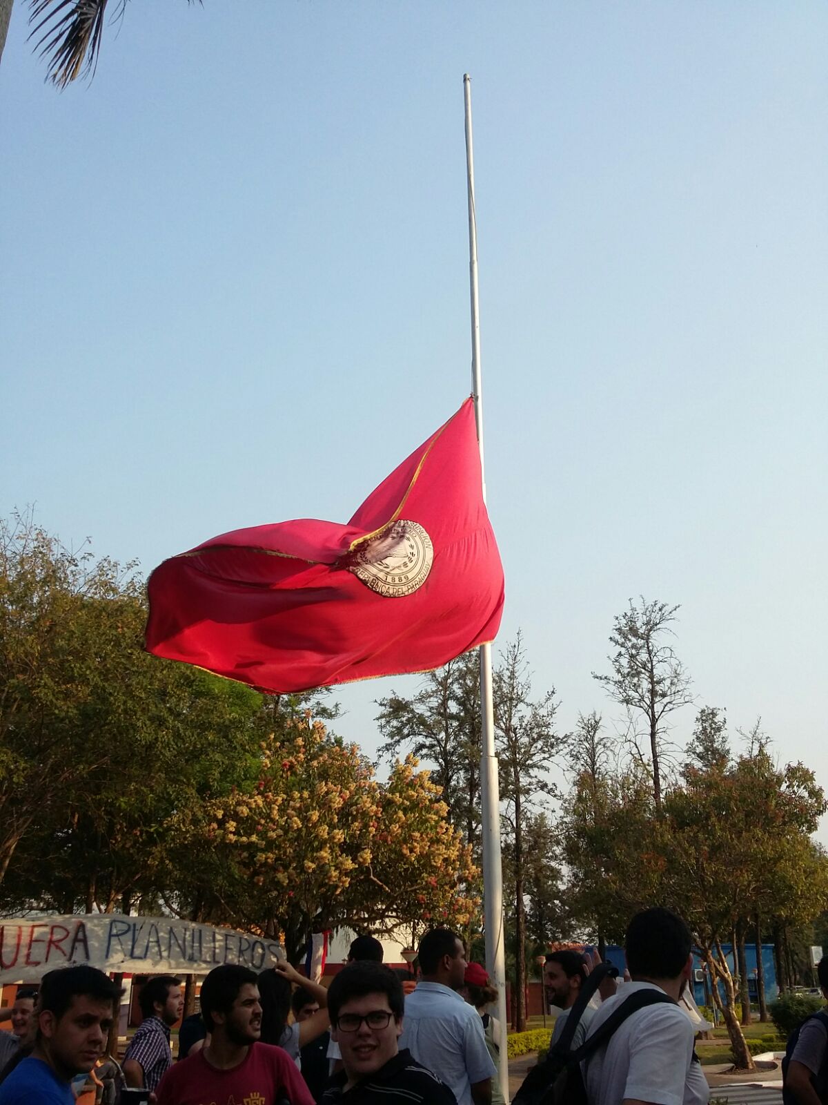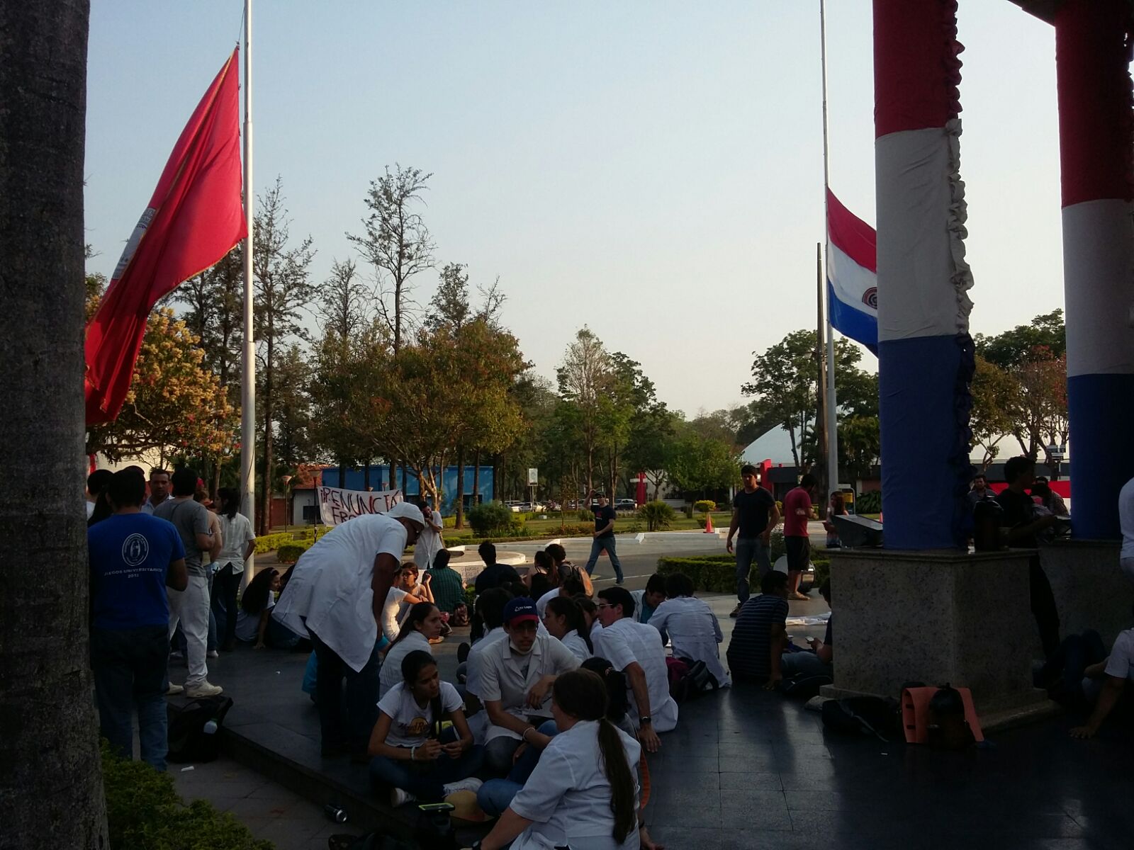 Un mensaje a nuestro número del Whatsapp que pidió anonimato por temor a represalias, nos informó que esta tarde a las 16:00 horas varios estudiantes realizaron una sentata frente al Rectorado de la Universidad Nacional de Asunción (UNA), el motivo principal sigue siendo el pedido de renuncia de su rector Froilan Peralta, y también afirman que es en solidaridad con alumnos de la facultad de ciencias veterinarias, quienes supuestamente reciben amenazas si se pliegan a cualquier movilización.