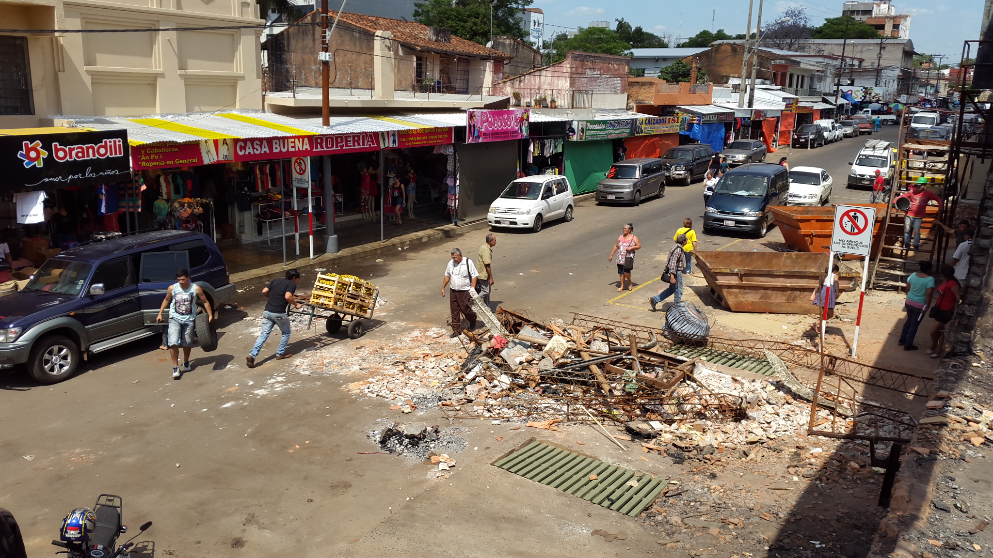 Un grupo de comerciantes cuyas casillas fueron arrasadas por el fuego de abril de este año, procedieron a sacar escombros y restos de materiales quemados al asfalto de la calle Gral. Caballero entre Julia M. Cueto y Mcal. Estigarribia, los materiales proceden de un predio colindante al mercado municipal que la comuna sanlorenzana compró semanas atrás, y que según dicen servirá para un futuro edificio donde serán reubicados unos 267 vendedores que antes del incendio se encontraban sobre la arteria mencionada.