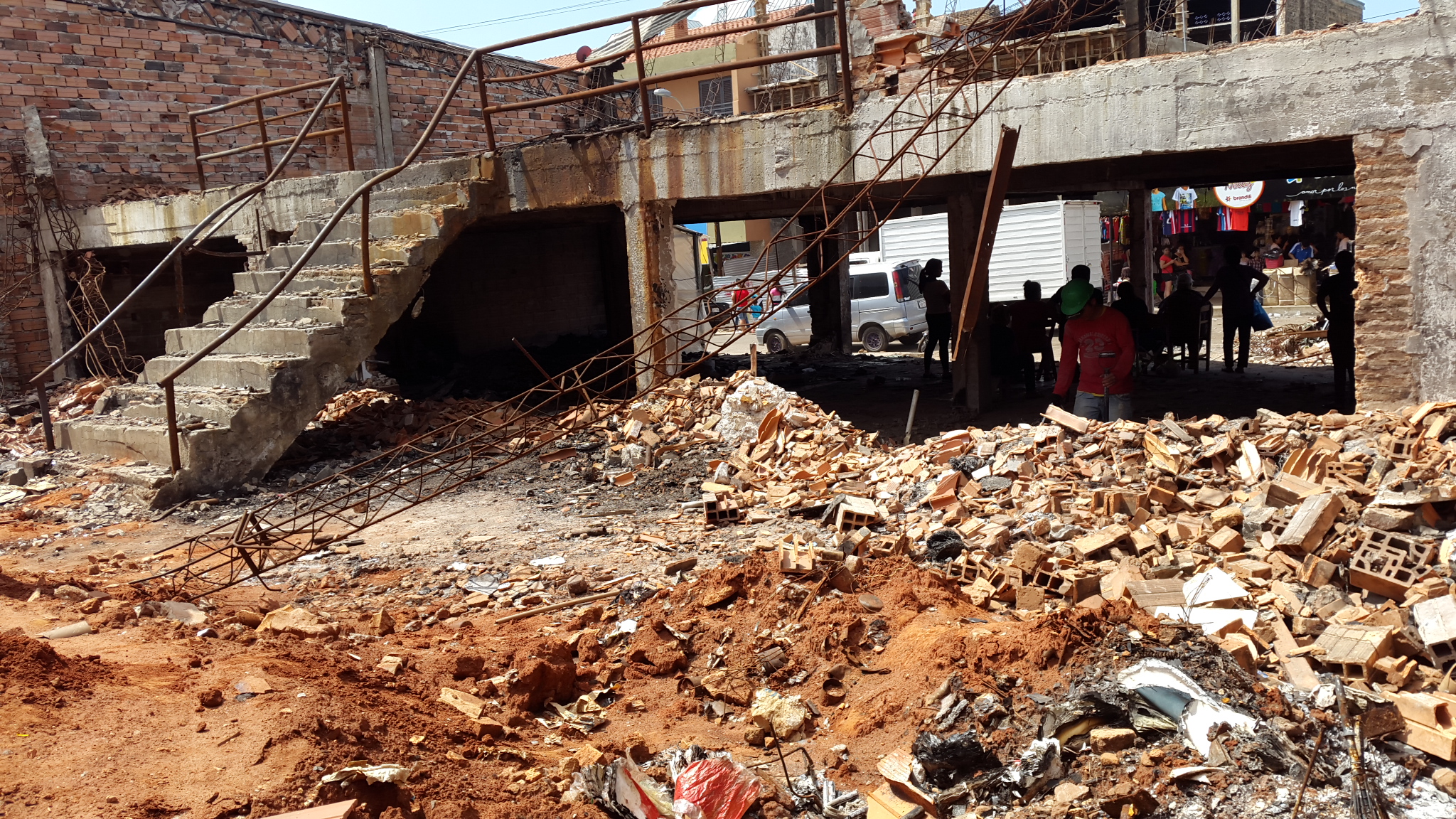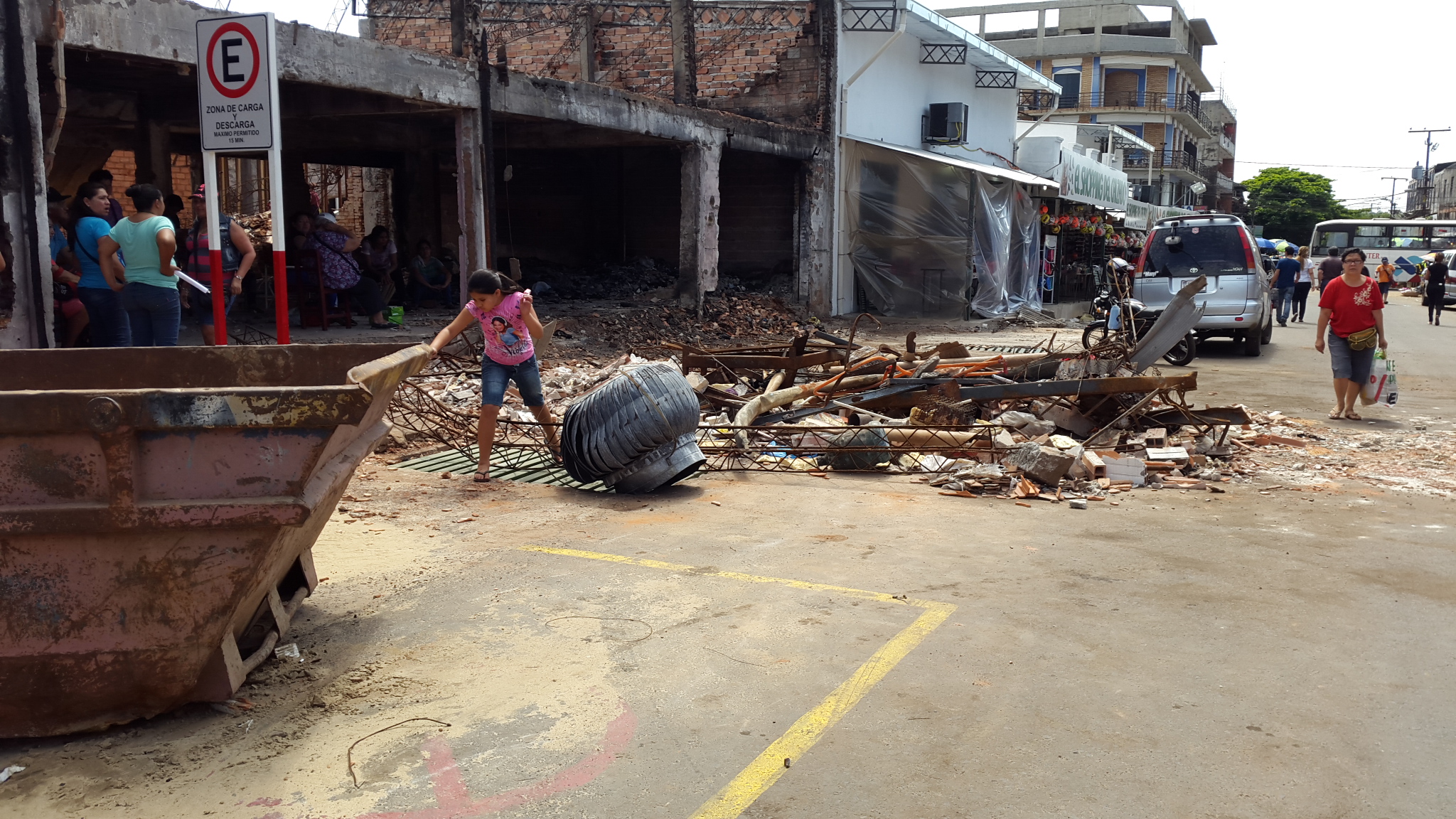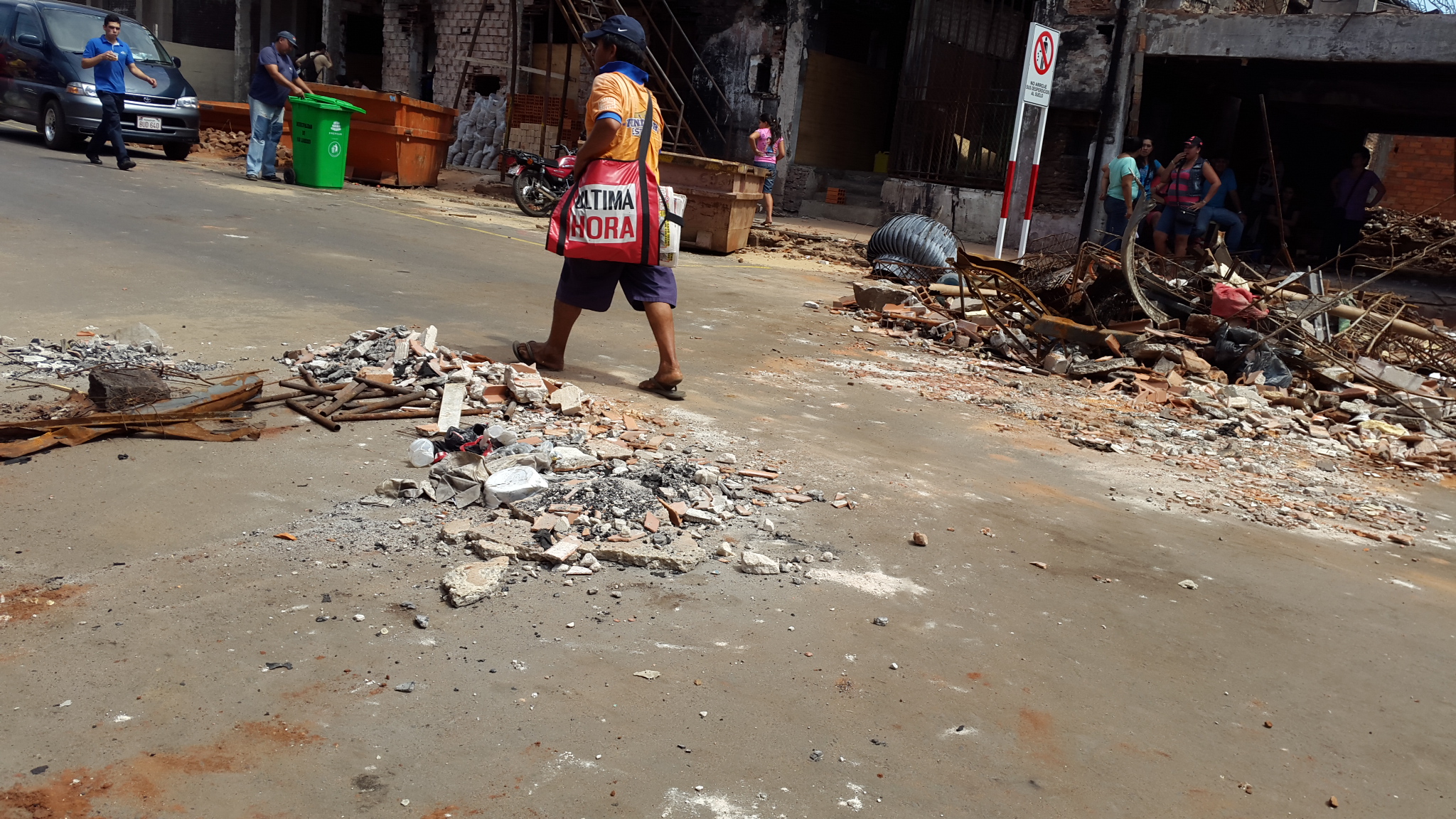 Un grupo de comerciantes cuyas casillas fueron arrasadas por el fuego de abril de este año, procedieron a sacar escombros y restos de materiales quemados al asfalto de la calle Gral. Caballero entre Julia M. Cueto y Mcal. Estigarribia, los materiales proceden de un predio colindante al mercado municipal que la comuna sanlorenzana compró semanas atrás, y que según dicen servirá para un futuro edificio donde serán reubicados unos 267 vendedores que antes del incendio se encontraban sobre la arteria mencionada.