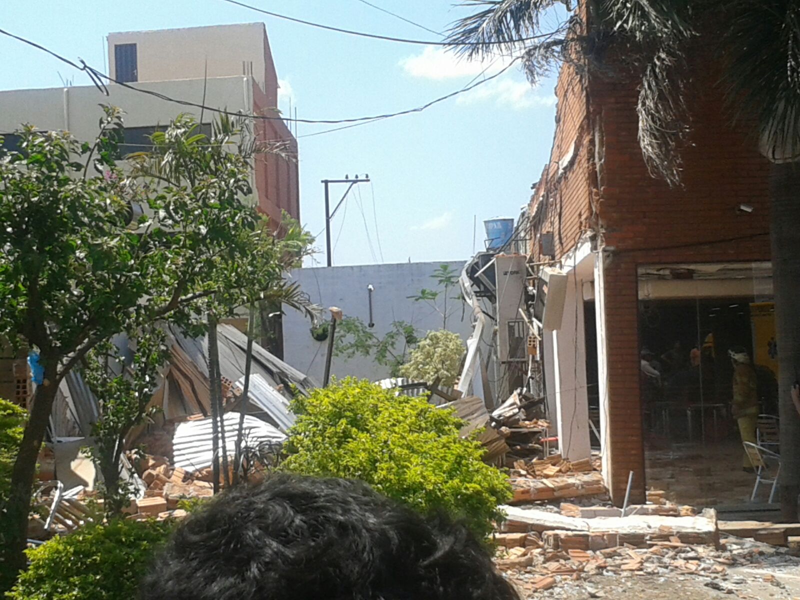 Cerca de las 13:00 horas de esta siesta, parte del techo de comidas del supermercado España se derrumbó sobre varias persónas que se encontraban en el lugar. Dicho edificio esta pegado al Departamento de Identificaciones de la Policía Nacional (Km 14) de San Lorenzo. La caída aparentemente fue por la explosión de un transformador de electricidad adyacente al edificio, aunque el presidente de la ANDE ingeniero Victor Romero, dijo al programa Algo Anda Mal de Radio Cardinal, que la máquina no tiene aspecto de haber explotado. Hay 10 heridos, informó Higinio Mendoza desde la zona del derrumbe. (Imágenes gentileza David Palacios)