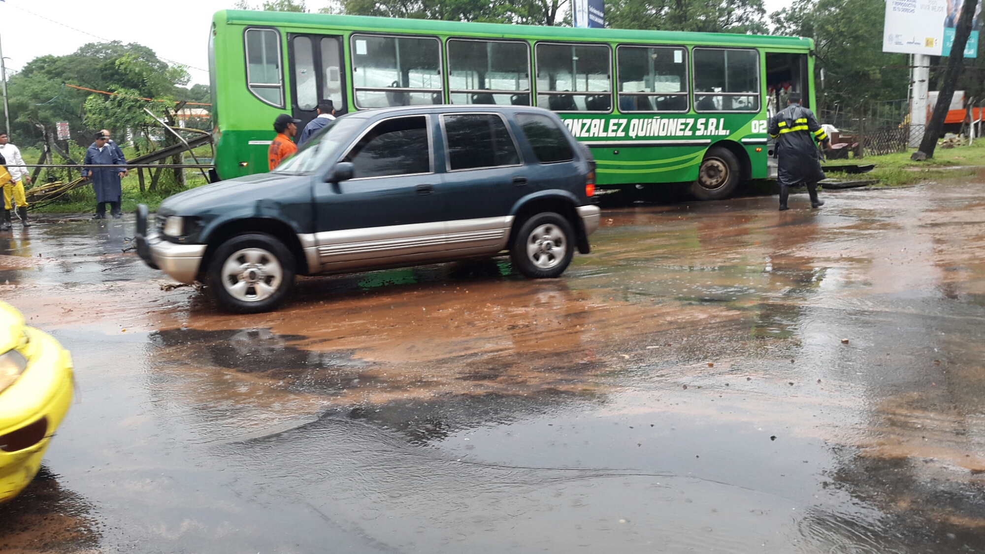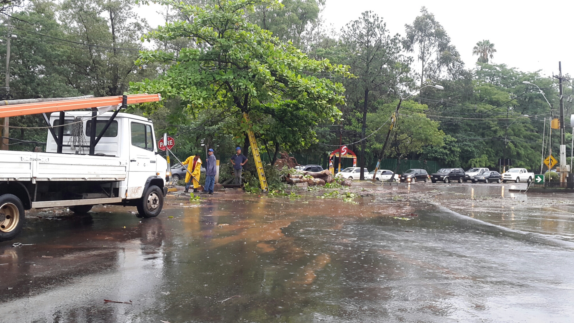 La tormenta de esta madrugada derribó varios árboles en el sector de ybera, que ocasionó corte en el transito vehicular. Para mayor complicación de la zona, un bus al servicio de la linea 19 cayó en una de las bocas de manantial que hay en las intercesiones de Mcal. Lopez, Dr Gabriel Pellon y Eugenio A Garay (San Lorenzo-Luque), tapando totalmente el tránsito automotor a los vehiculos que bajan por Saturio Rios.