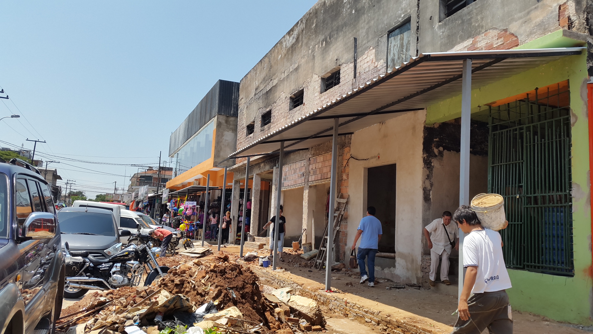 COLOCACIÓN DE TECHO PUEDE IMPEDIR TRABAJOS DE ALBAÑILERIA EN LA FACHADA DEL COEMEDOR DEL MERCADO. El grupo liderado por Marcela Romero, que ocupaban ilegalmente la calle Gral. Caballero y que perdieron todas sus mercaderías en el incendio de abril de este año, querían colocar a toda costa un techo de metal en la vereda del comedor del mercado siniestrado, que según ellos servirá para cubrir de los rayos del sol a los trabajadores. Por otro lado otro grupo que está actualmente dentro del mercado liderado por Ernesta de Torres, buscó impedir la colocación del techo, defendiendo la posición de que no se haga nada antes de concluir trabajos de albañilería que se realiza por la fachada del comedor, que incluye revoques, pinturas e incluso la colocación de pisos en la vereda.