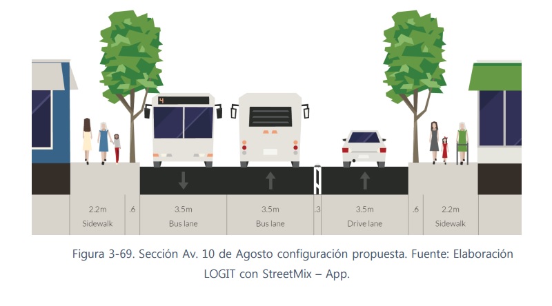 En dicha conclusión acompaña figuras donde aparecen incluso las posibles estaciones durante el trayecto, como ser el de la estación N° 26, que podrá estar a la altura de 10 de Agosto entre las calles Cnel. Romero y Rodríguez de Francia, en esta intercesión se contempla la expropiación de terrenos ya que el ancho de la calle deberá aumentar para dar lugar a dársenas donde los buses entraran para el descenso y descenso de pasajeros. También mediante figuras están propuestas las medidas que deberá tener los carriles respectivos que incluyen una exclusiva para los buses de ida y otra de vuelta, también se propone un carril pequeño por donde se desplazaran exclusivamente vehículos de propietarios de frentistas. En este punto el tamaño de ambas veredas disminuirán de 3.5 mts a 2.2 mts, de manera a dar espacio a la circulación de los tres carriles (bus de ida, bus de vuelta y carril para vehículo del frentista).