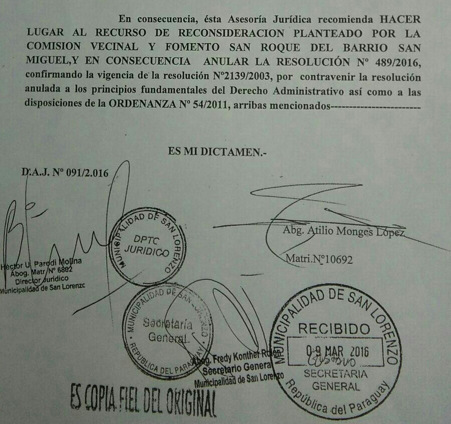 La Asesoría Jurídica de la Municipalidad de San Lorenzo recomendó al intendente Albino Ferrer anular la Resolución de la Intendencia Municipal N° 489/16 que amplía la zona de influencia de la Comisión Vecinal San Roque del barrio San Miguel. Los abogados de la Municipalidad concluyeron que dicha resolución no tiene validez por contraponerse a los principios fundamentales del derecho administrativo y por no estar en concordancia con algunos de los artículos de la Ordenanza Municipal N° 54/2011 que reglamenta las Comisiones Vecinales de la ciudad.