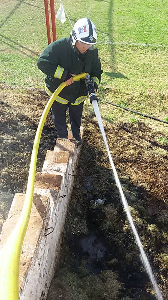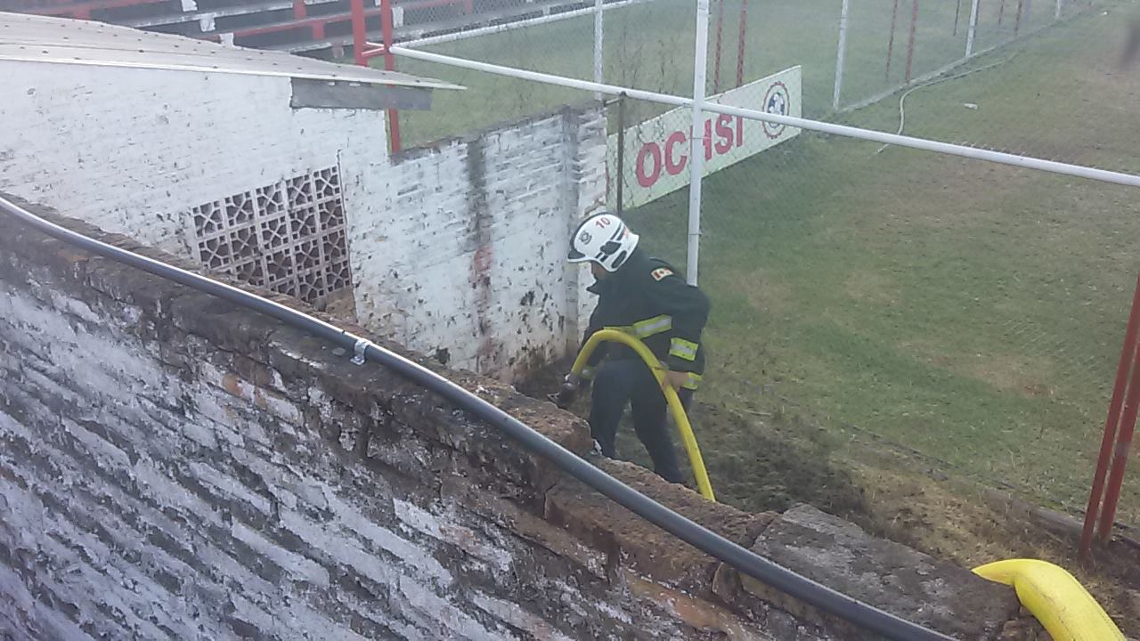 Bomberos Voluntarios del cuartel Capitán Juan Speratti, acudieron dos veces hoy hasta las instalaciones de la cancha del Sportivo San Lorenzo para apagar las llamas originadas en el pasto del sector norte de la cancha. Según el bombero Favian Mendoza, acudieron a la mañana y luego por la tarde por la misma situación. Aparentemente se quemó de forma accidental un montículo de basura la que se propagó por un pequeño pastizal ubicado en una de las esquinas del sector norte del estadio Gunther Voguel. El fuego no afectó el campo de juego. (Imagen: Gentileza Fabian Mendoza)