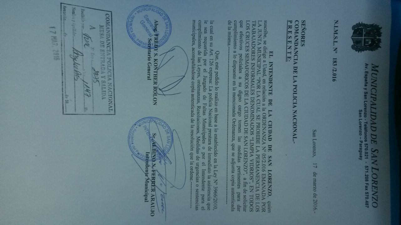 Policía Nacional para que los limpiavidrios salgan de sus habituales puestos, ya que el intendente Albino Ferrer, comunicó vía nota a la Comandancia de la Policía Nacional sobre la vigencia de la Ordenanza 05/16 que prohíbe la actividad de los limpiavidrios en las calles de la ciudad.