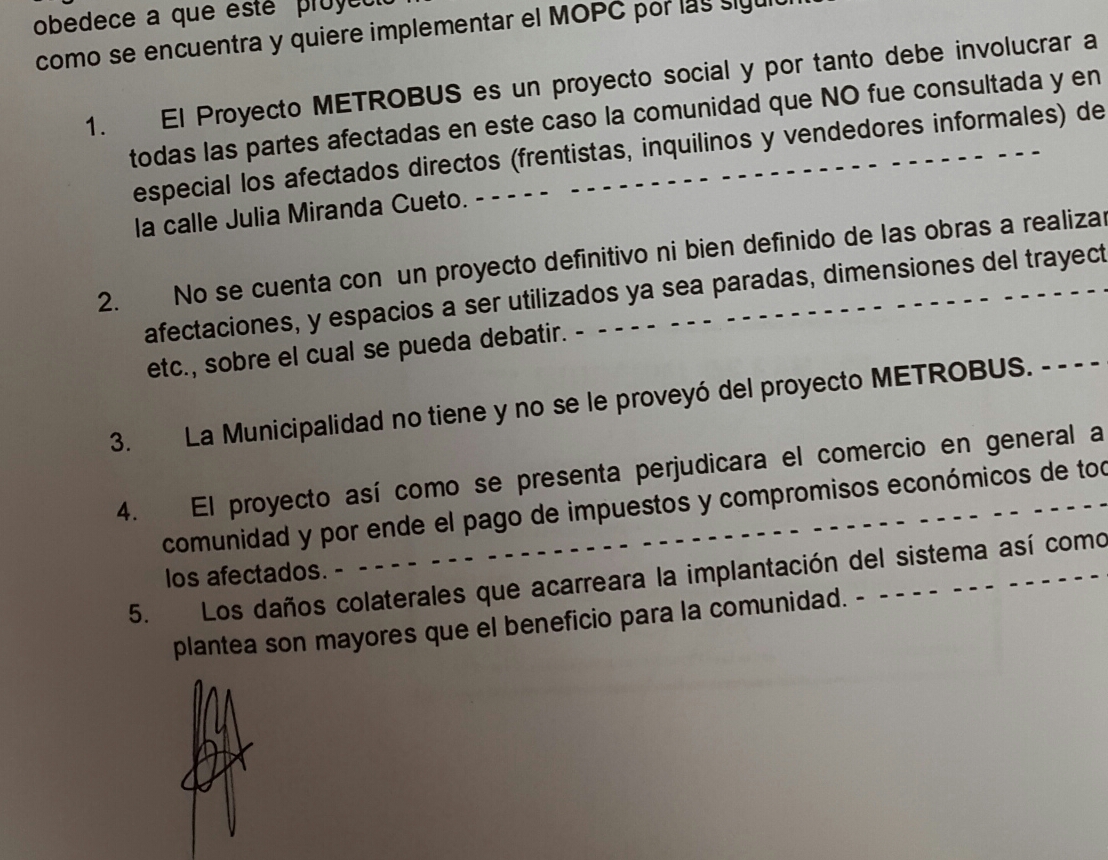 La Cámara de Comerciantes y Empresarios de San Lorenzo (en formación), presentó una nota dirigida a la Junta Municipal de la ciudad, donde pide que los concejales revoquen una resolución que sugiere al intendente Ferrer firmar el convenio con el Ministerio de Obras Púbicas y Comunicaciones (M.O.P.C) donde figura el Ok para que los buses del Metrobus utilice como única vía (entrada y salida) la calle Julia M. Cueto. Los firmantes del documento dicen que así como el M.O.P.C plantea la circulación de los buses articulados en el centro de la ciudad traerá más daños que beneficios. Además señalan que ni la municipalidad accedió a lo que se hará en detalles por dicha obra.