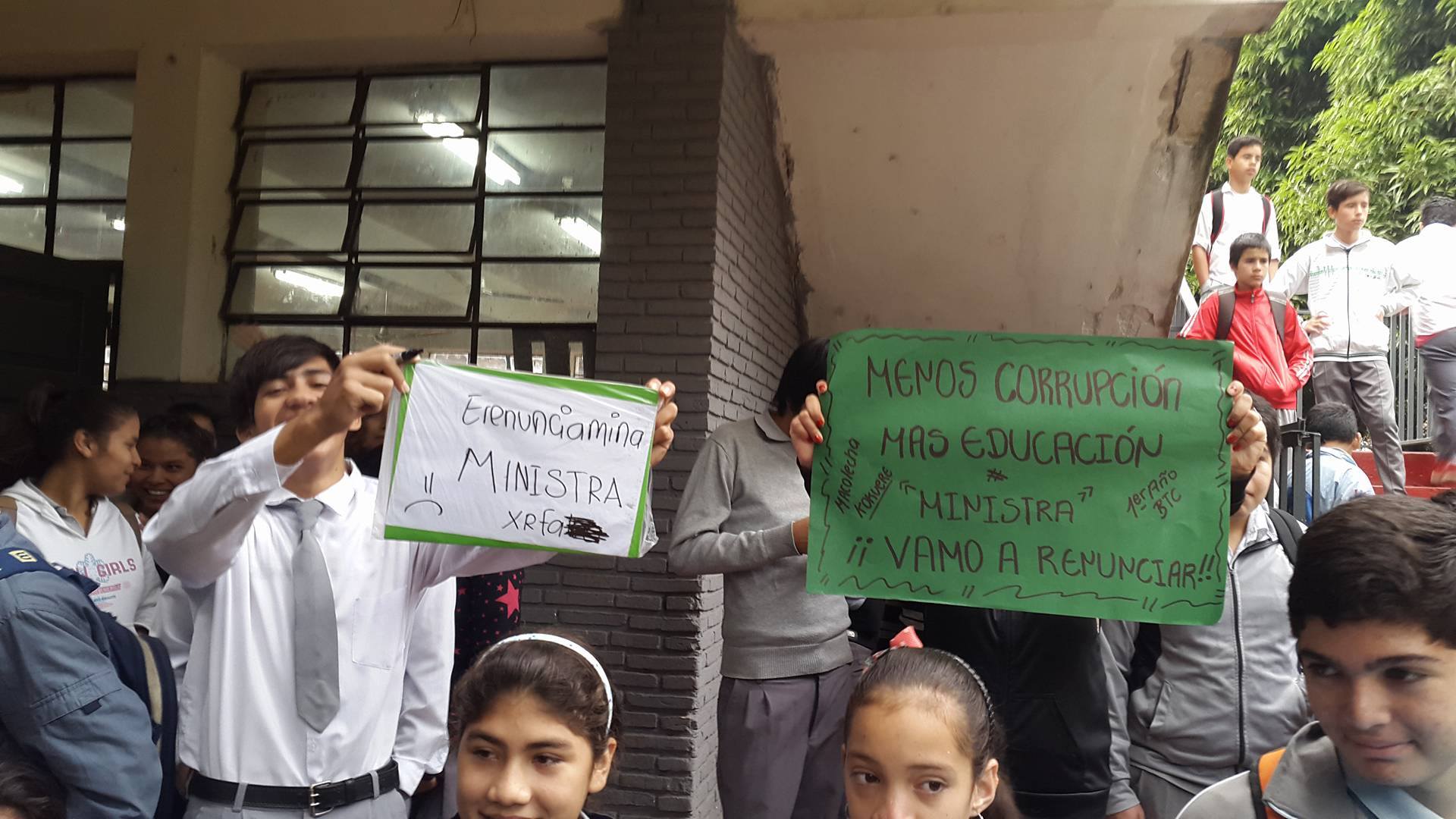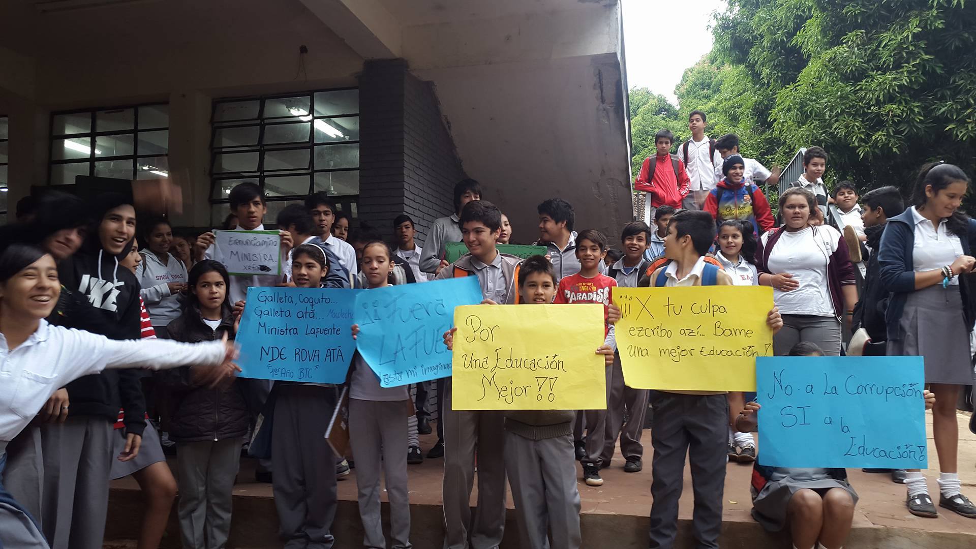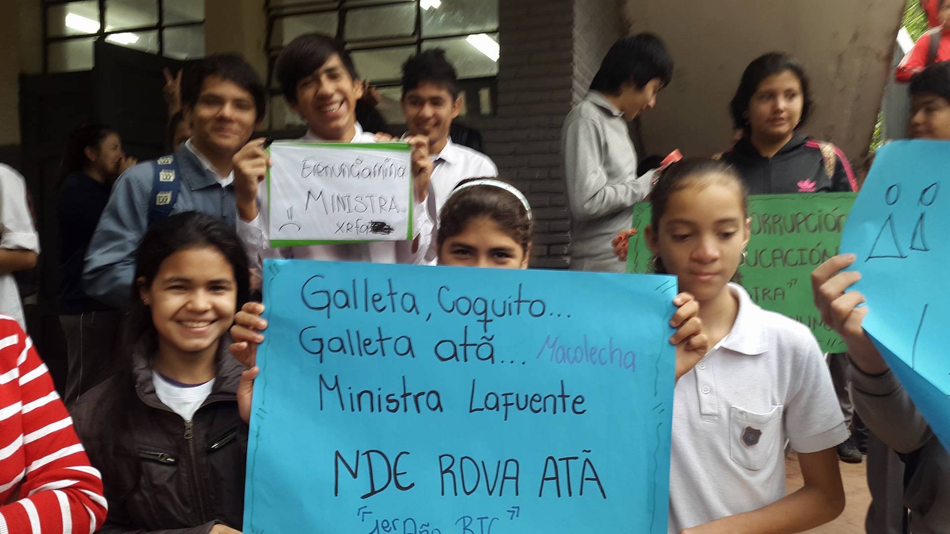 Docentes y funcionarios del Colegio Concepción Leyes de Chaves y de la Escuela Anastacia Vallejos del barrio Kokueré de San Lorenzo, se vieron sorprendidos cuando llegaron a su institución educativa ya que se encontraron que varios de sus alumnos estaban en plena protesta como adhesión a la movilización estudiantil que pide la renuncia de la Ministra Marta Lafuente.