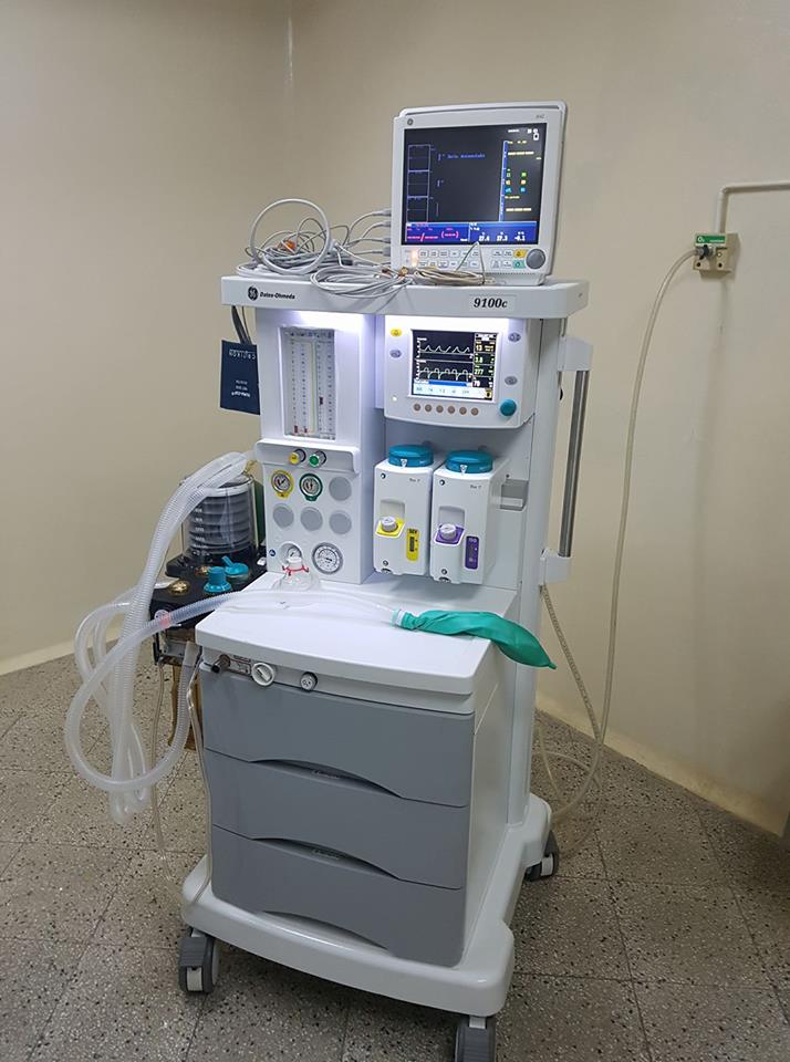 El segundo equipo es una máquina de anestesia general, con alta tecnología de la marca General Electric Datex – Ohmeda. Tiene doble línea de presión invasiva de temperatura. Capnógrafo monitor color HD con su correspondiente soporte.