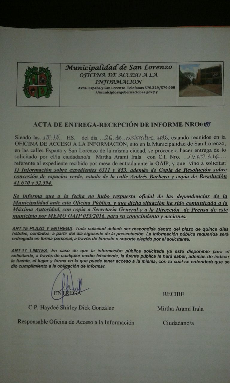 CONFIRMADO LA NEGATIVA. Cabe destacar que los solicitantes cuentan con una nota firmada por la responsable de la Oficina de Acceso a la Información Pública de la Municipalidad Lic. Shirley Dick, quien informó a los mencionados contribuyentes que cumplido los 15 días hábiles que dicta la Ley 5282/2014 no hubo respuesta oficial de las dependencias de la Municipalidad y que dicha situación ha sido comunicado a la máxima autoridad, con copia a Secretaría General y a Prensa Municipal.
