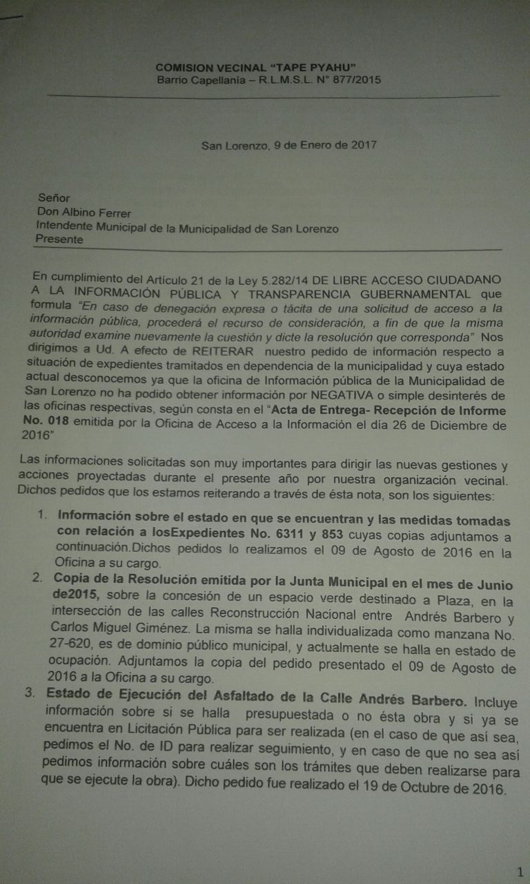Vecinos miembros de la Comisión Vecinal Tapé Pyahú del barrio Capellanía reiteraron a la Municipalidad de San Lorenzo pedidos de información pública que no obtuvieron respuesta en una primera vez. Ahora los funcionarios responsables corren el riesgo de ser sancionados por incumplimiento de la Ley 5282/2014 “De Libre Acceso Ciudadano a la Información Pública y Transparencia Gubernamental”. En una de las solicitudes sólo piden copia de una resolución municipal y en otra quieren conocer si existe plan de asfaltado de una calle, y si existiere piden conocer detalles de los mismos (Numero de ID de llamado a licitación).