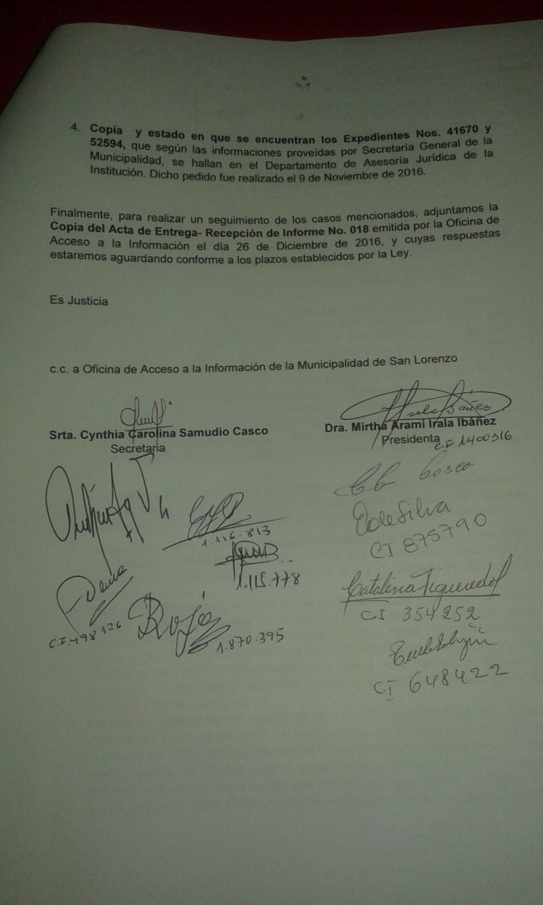 Los solicitantes advirtieron a las autoridades que si se les vuelve a negar las informaciones requeridas recurrirán a las instancias pertinentes que dicta la Ley 5282/2014.