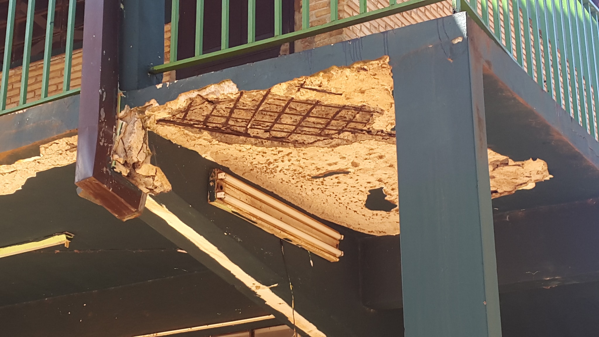 Unirme ahoraEl bloque perteneciente al Colegio que se encuentra en el mismo predio de la escuela también sufre de graves fallas en la planta alta, la parte del piso de la terminación de la escalera tiene erosiones bastante peligrosas e incluso se puede notar que el concreto va desprendiéndose y cayéndose al suelo, en gran parte ya se ven varillas totalmente oxidadas que ponen en peligro a los estudiantes que deben pasar pisando esa parte para llegar a sus clases que se encuentran en la planta alta. Además pudimos observar que el techo de la mencionada edificación también está en muy malas condiciones.