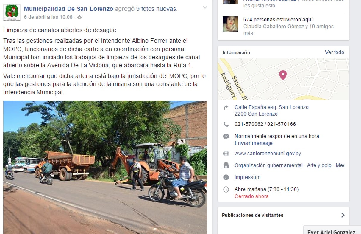 El día 6 de abril pasado la municipalidad de San Lorenzo publicó en su página del Facebook que el Ministerio de Obras Públicas y Comunicaciones empezó a limpiar los canales de desagüe a cielo abierto de la avenida De la Victoria de Reducto que iría hasta la salida de la Ruta 1. Pero en la realidad la limpieza no será en toda su extensión y sólo fue de 30 metros, de manera que los canales de agua seguirán sucios lo que hace que en cada lluvia reboce e inunde gran parte de la mencionada avenida.
