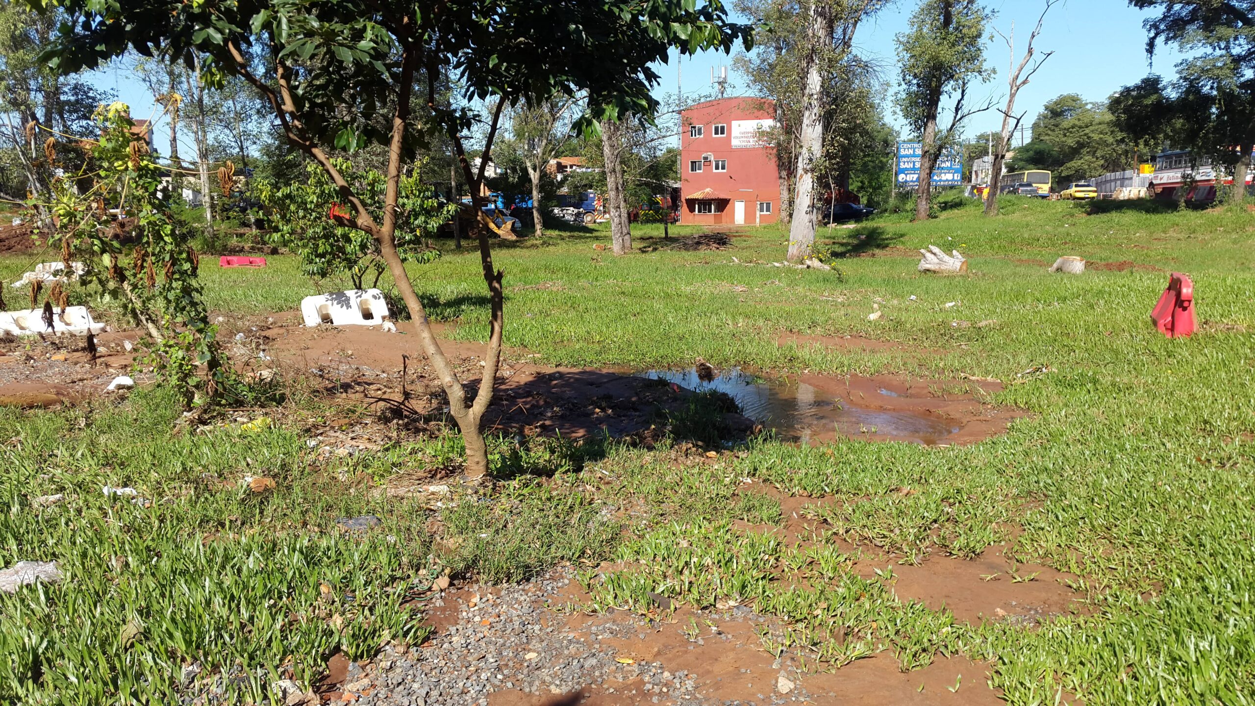El pasado martes cuando visitamos el predio tuvimos que caminar por el barro y algunas ramas que cayeron con la tormenta de días anteriores, también pudimos observar distintos tipos de residuos que fueron arrastrados por los raudales de la última lluvia caída. A esto se agrega la existencia de piedritas de concreto prácticamente en el borde del manantial. Cabe señalar también que las máquinas pesadas están trabajando a unos 30 metros del lugar, por lo que si el ykua no se señala, corre el riesgo de que alguna máquina pase por encima e incluso se enterrado por desconocimiento de su existencia.