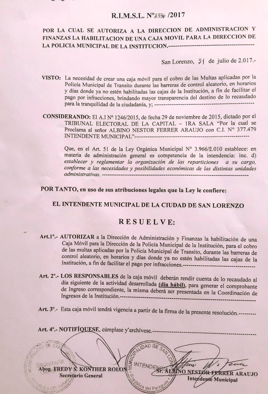 El intendente Albino Ferrer autorizó mediante la Resolución Municipal N° 1336/2017 a la Dirección General de la Policía Municipal para portar una caja móvil a ser utilizada en las barreras aleatorias que se realiza los fines de semana en San Lorenzo. La decisión es para evitar la retención del vehículo cuyo conductor trasgreda algunas faltas al tránsito automotor, de tal manera a pagar las multas en el mismo lugar. La recomendación a los multados es que exijan la boleta legal, de manera a confirmar el pago respectivo.