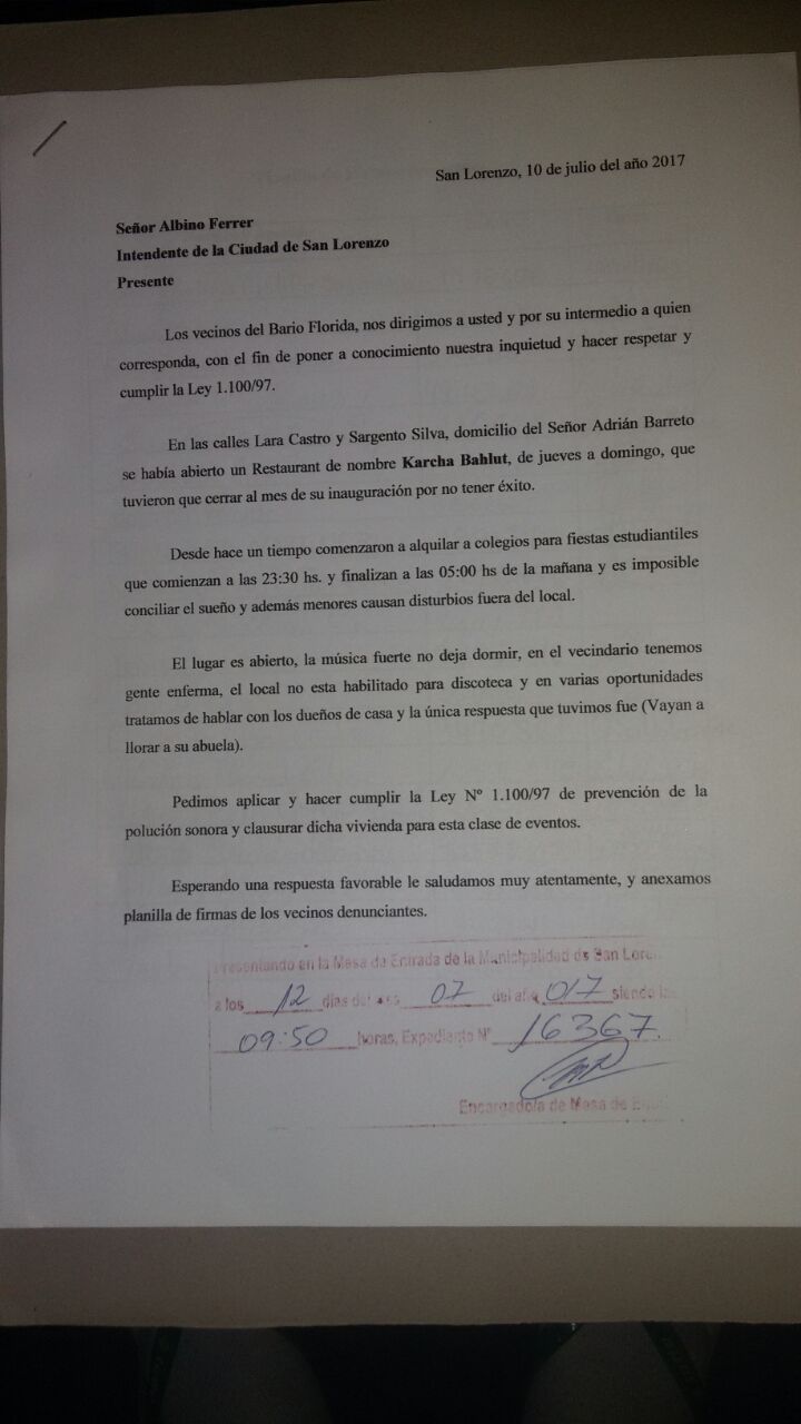 Según Humberto Diáz (vecino del barrio Florida de San Lorenzo) el 10 de julio de este año presentaron a la municipalidad de San Lorenzo una nota vía mesa de entrada donde piden la intervención del local conocido como Karcha Valut por varios hechos de vandalismo y faltas contra la Ley N° 1100/97 “De Prevención de la Polución Sonora”.