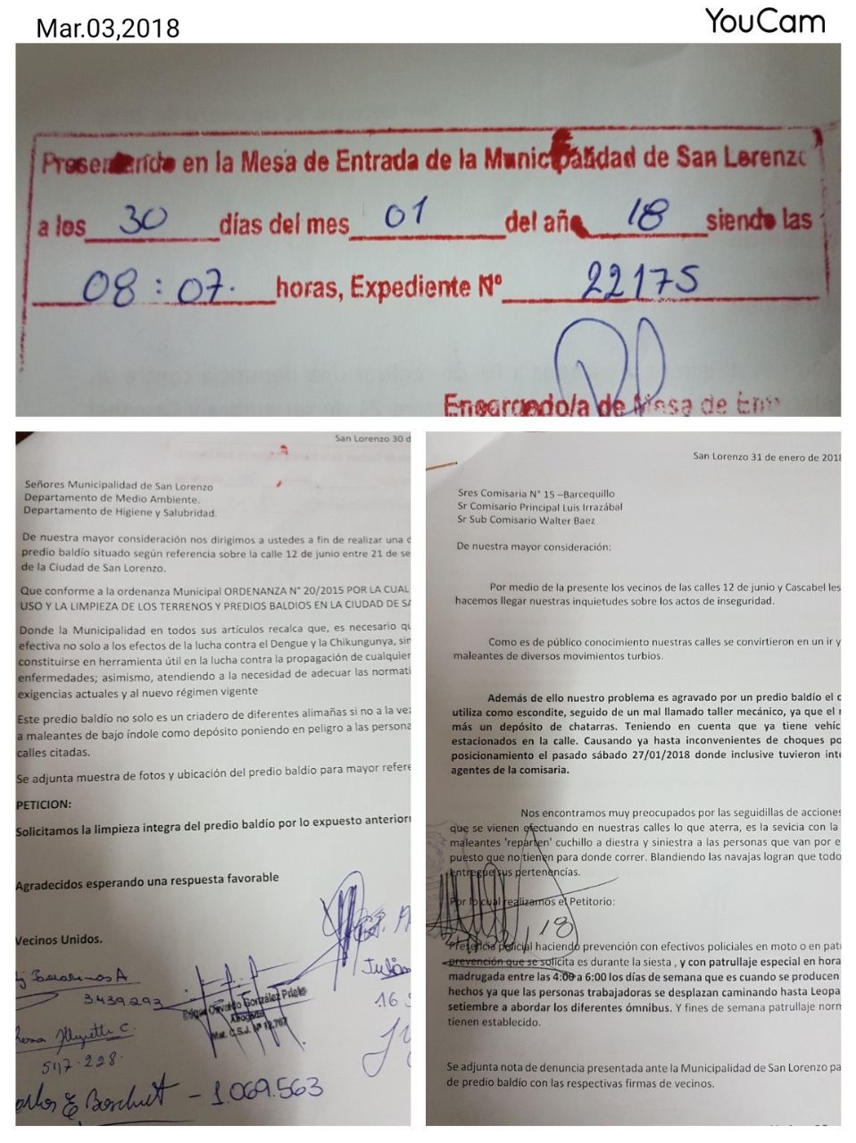 Liz Paola Rivas Allegretti hizo llegar a nuestro número de WhatsApp (0983.583030) un escrito donde recuerda que en fecha 30 de enero de éste año ha hecho llegar a la Municipalidad de San Lorenzo una nota de pedido de limpieza de predios baldíos que va acompañada con imagen satelital y su ubicación por coordenada exacta (calle 12 de Junio entre 21 de Setiembre y Cascabel, sin embargo hasta ahora nunca llegaron los funcionarios para la limpieza respectiva. Por último expresa que si alguna persona de la zona falleciera de algún tipo de dengue será responsabilidad del intendente y los doce concejales. Termina su carta con un “BASTA DE CALENTAR SILLAS. “QUE EMPIECE LA ACCIÓN