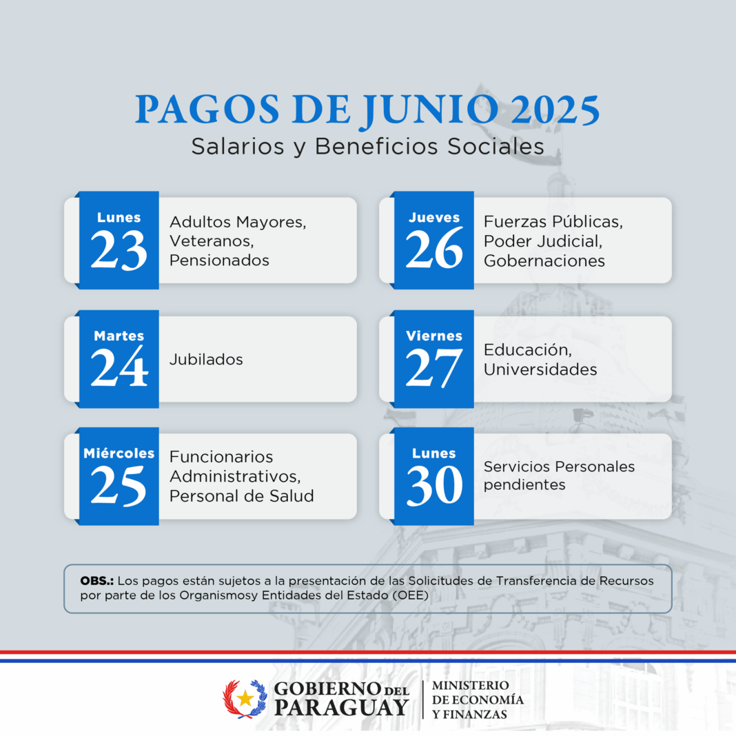 El Ministerio de Economía y Finanzas (MEF) informó que a partir de este lunes 23 de junio comenzará el cronograma de pagos de salarios y beneficios sociales correspondiente al mes, que se extenderá hasta el lunes 30 de junio.