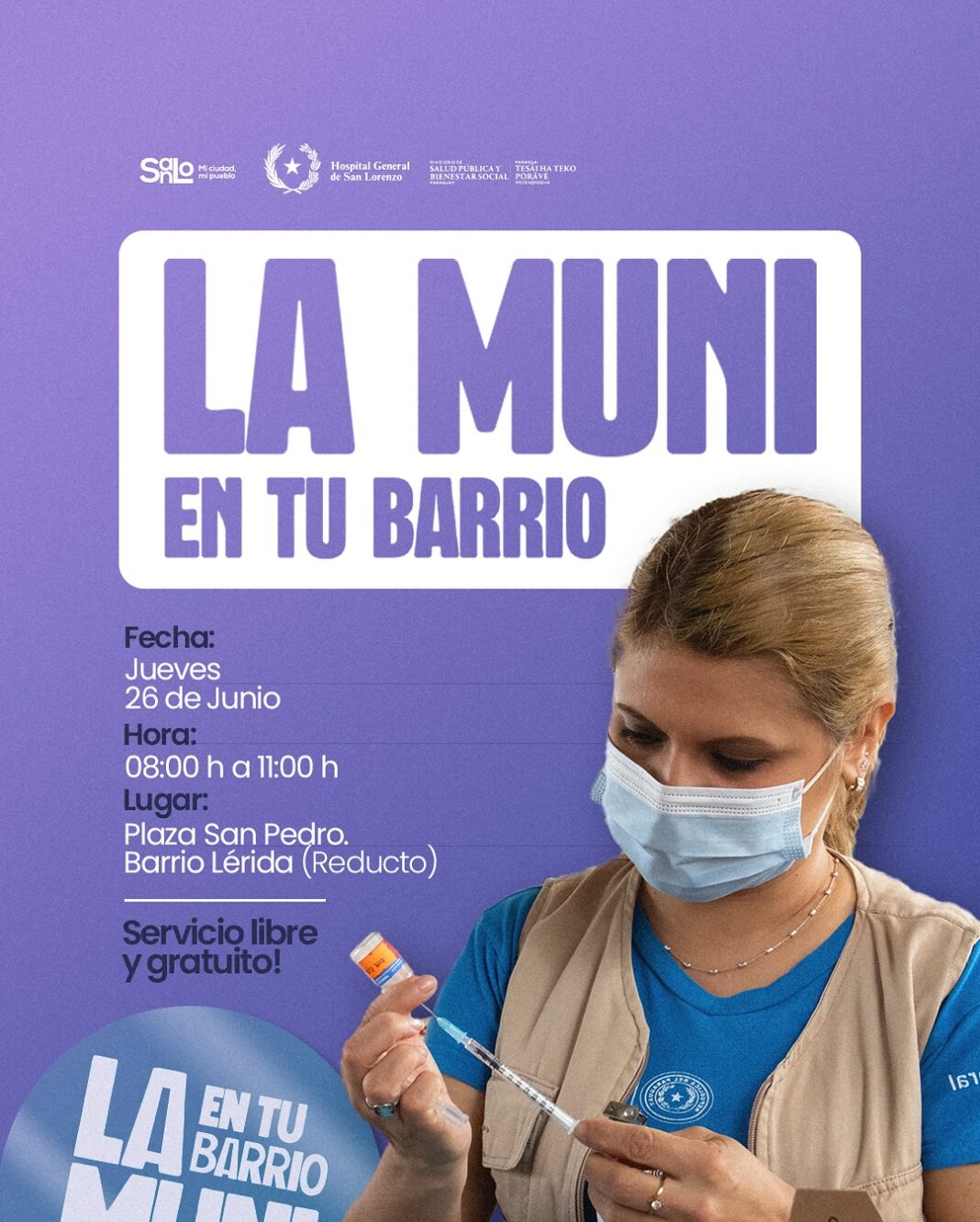 La Municipalidad de San Lorenzo informa a la ciudadanía que el próximo jueves 26 de junio, se llevará a cabo una nueva jornada del programa «La Muni en tu Barrio», en la Plaza San Pedro del barrio Lérida (Reducto), en el horario de 08:00 a 11:00 horas.