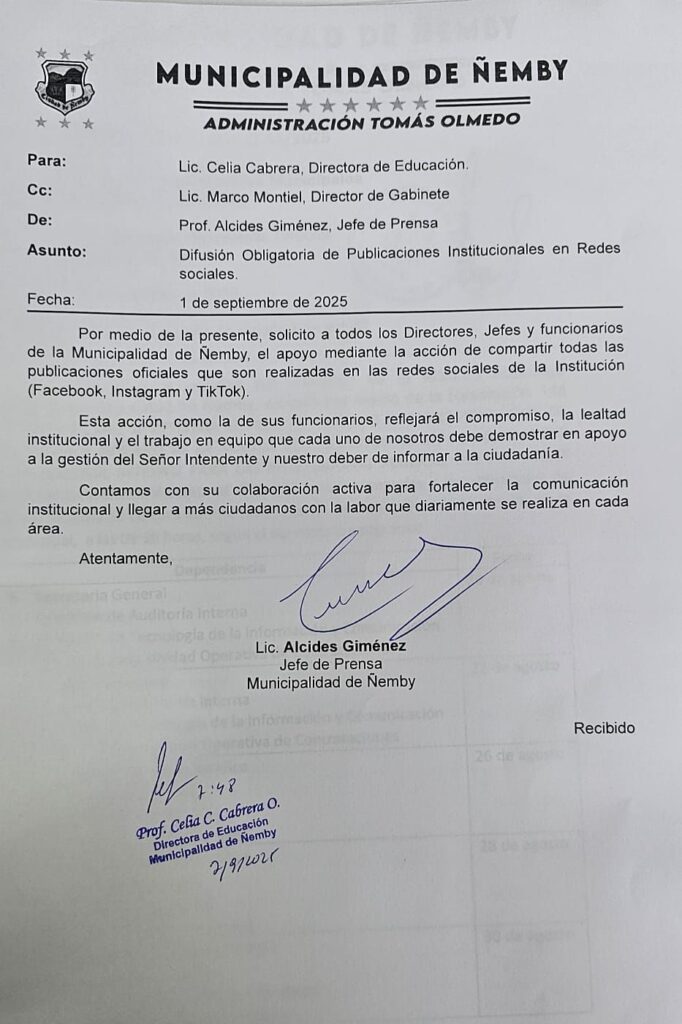Una nota interna, con el encabezado “Difusión obligatoria de publicaciones institucionales en redes sociales”, habría sido enviada a directores, jefes y demás funcionarios de la Municipalidad de Ñemby, ordenándoles compartir las publicaciones oficiales.