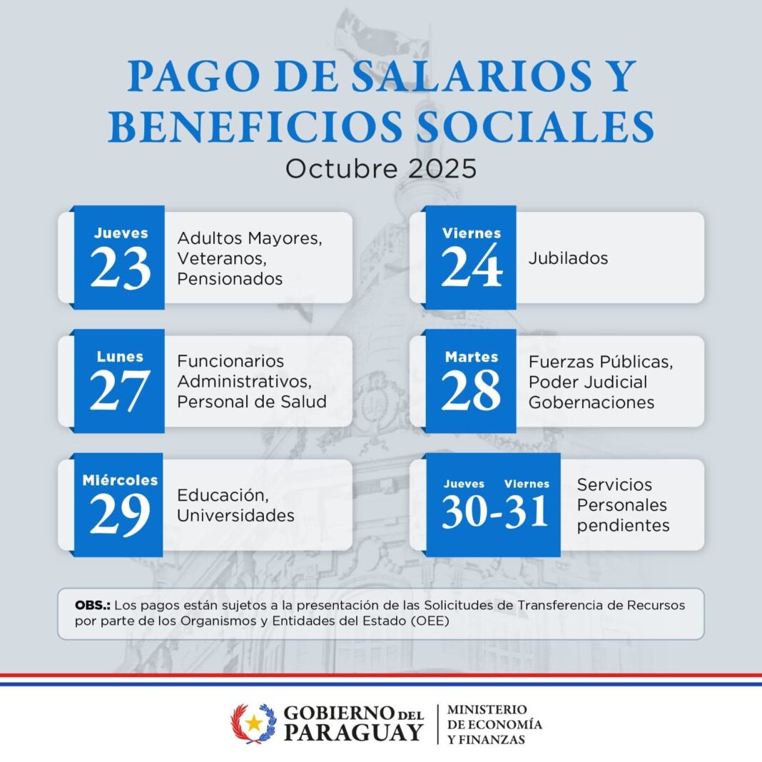 El Ministerio de Economía y Finanzas (MEF) informó que este jueves 23 de octubre comenzará el cronograma de pagos de salarios y beneficios sociales correspondientes al mes en curso.