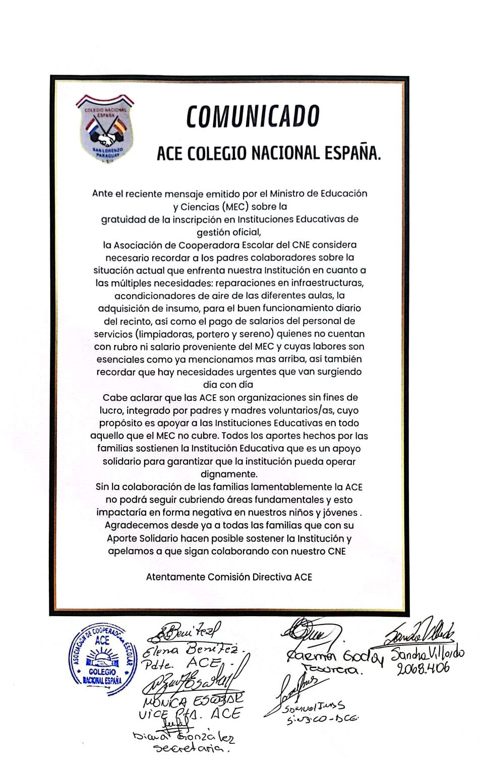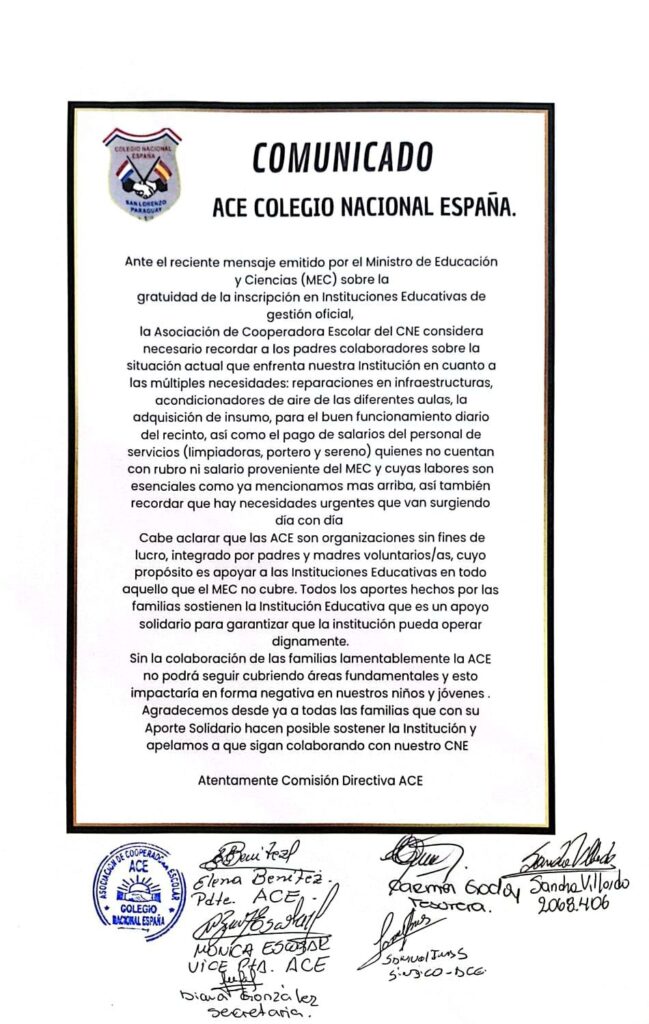 La Asociación de Cooperadora Escolar (ACE) del Colegio Nacional España, de San Lorenzo, emitió un comunicado tras el anuncio del Ministerio de Educación y Ciencias (MEC) sobre la gratuidad de la inscripción en instituciones de gestión oficial.