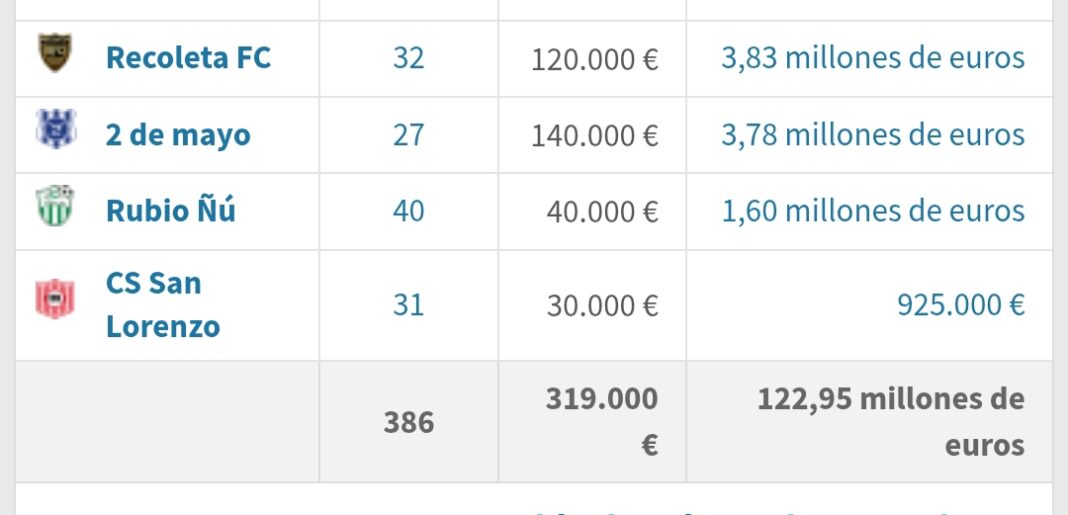 En contraste, clubes como Cerro Porteño y Olimpia lideran el listado con valores totales que superan los 29 y 26 millones de euros, respectivamente, marcando una diferencia considerable en términos de inversión estimada en transferencias.
