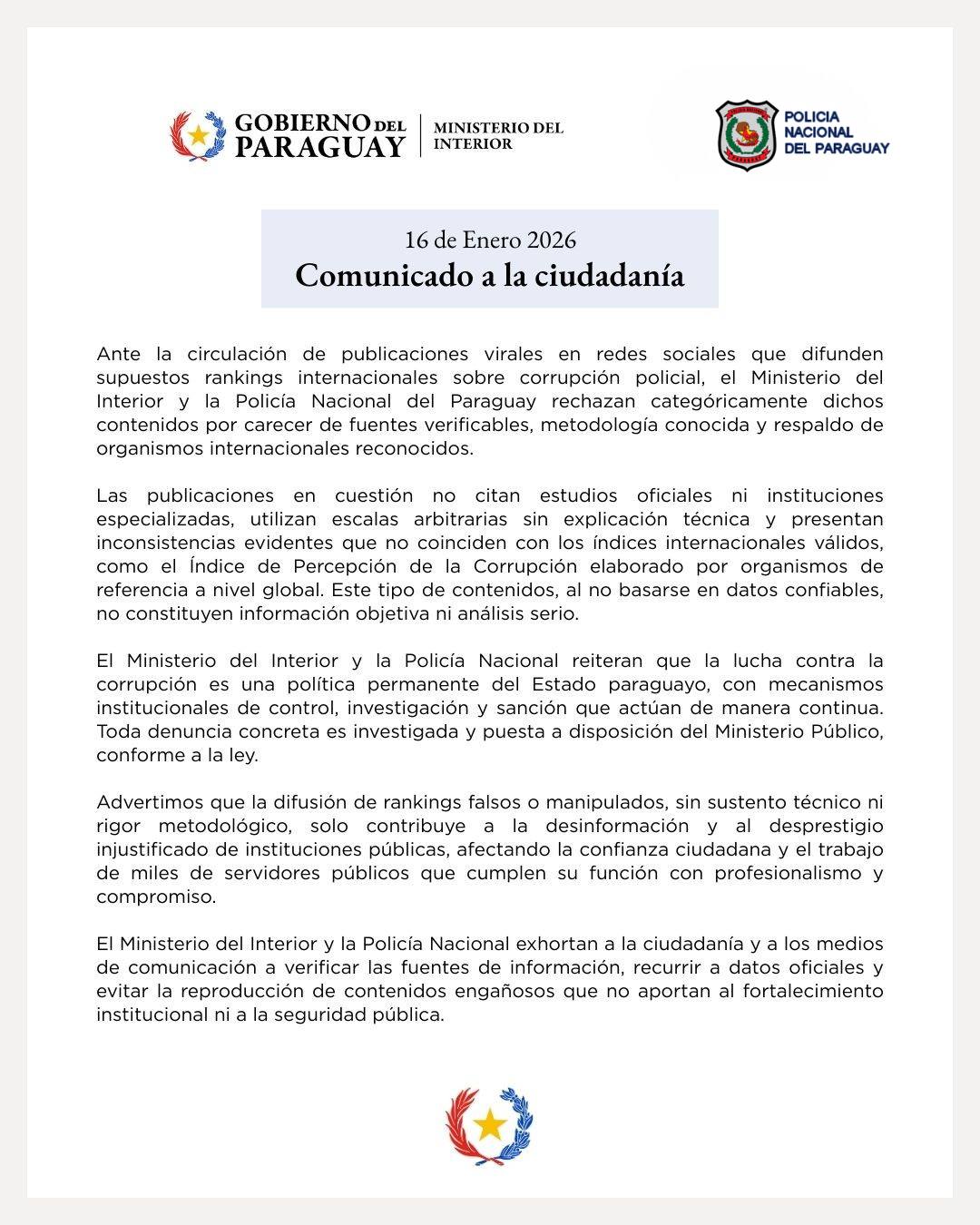 Desde el Ministerio del Interior y la Policía Nacional reiteraron que la lucha contra la corrupción es una política permanente del Estado paraguayo. Advirtieron que la difusión de “rankings falsos o manipulados”, sin sustento técnico, afecta la confianza ciudadana y perjudica el trabajo de miles de servidores públicos que cumplen sus funciones con profesionalismo y compromiso.