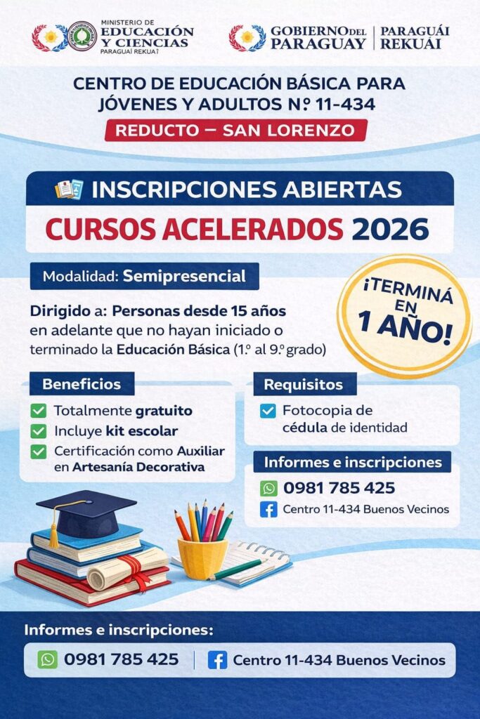 El Centro de Educación Básica para Jóvenes y Adultos N.º 11-434 habilitó las inscripciones para los cursos acelerados 2026, dirigidos a personas desde los 15 años que no hayan iniciado o culminado la Educación Escolar Básica.